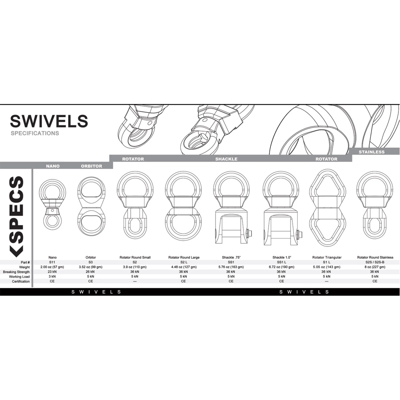 The Nano by Rock Exotica is the lightest load-rated swivel available. It features an integrated rubber o-ring that holds it snugly in place on most carabiners.